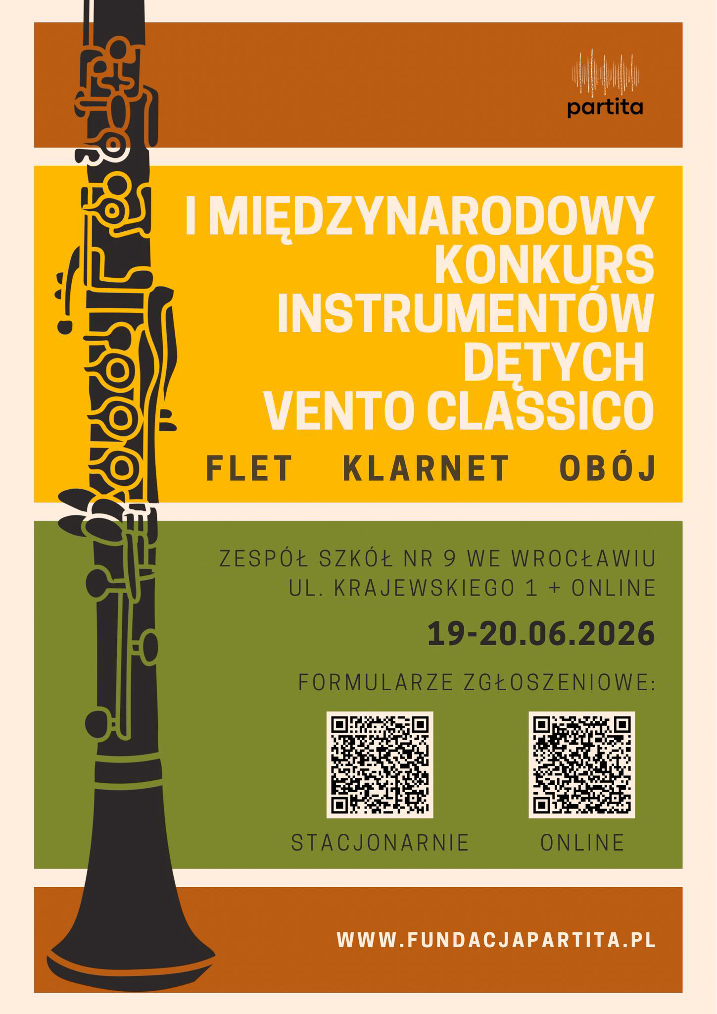 Zapraszamy do udziału w I Międzynarodowym Konkursie Instrumentów Dętych VENTO CLASSICO. Wydarzenie obejmujące instrumenty dęte drewniane: flet, klarnet oraz obój odbędzie się w dniach 19–20 czerwca 2026 roku w Zespole Szkół nr 9 we Wrocławiu przy ul. Krajewskiego 1. Konkurs odbędzie się w formule hybrydowej.